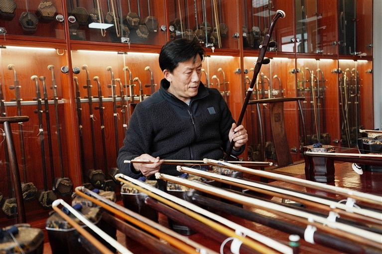 3月28日,制琴师卜广军在江苏无锡梅村街道二胡产业园古月琴坊车间调试二胡。
