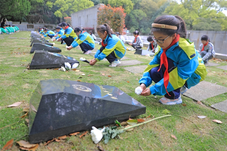 图为学生们正在烈士墓前敬献自己制作的小白花。