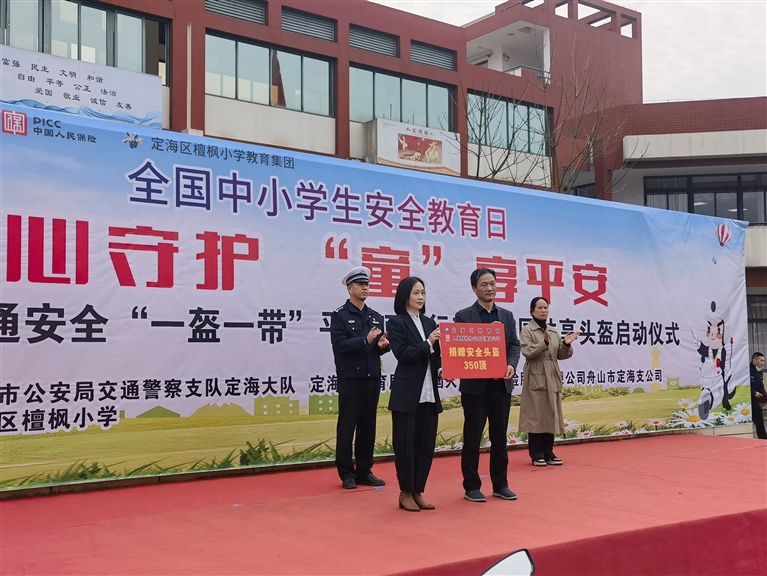 活动现场,人保财险定海支公司向定海区教育局捐赠350顶安全共享头盔供全区中小学使用。