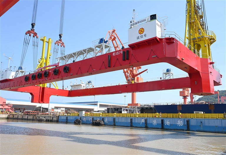 4月9日拍摄的吊至港池上方的“乾动2号”深远海养殖平台。当日,“乾动2号”深远海养殖平台下水仪式在位于福建福州市连江县粗芦岛的马尾造船股份有限公司举行。“乾动2号”总长67.6米、总宽33.9米,搭载了各类智能养殖系统及检测系统等现代化渔业生产设备,所有数据可无线传输到养殖户手机终端上,实现智慧养殖。2022年9月,“乾动1号”成功投入运营,开创了深远海高品质大黄鱼智慧养殖的新模式。“乾动2号”的下水标志着“乾动”系列深远海平台养殖模式进入快速复制阶段。 新华社记者 林善传 摄