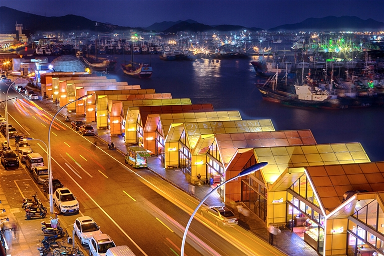 今年2月6日,沈家门海鲜夜排档全新开市。东起半升洞,西至中兴路口,48个标准铺面沿着滨港路一字排开,全长1.4公里,占地面积约5000平方米。