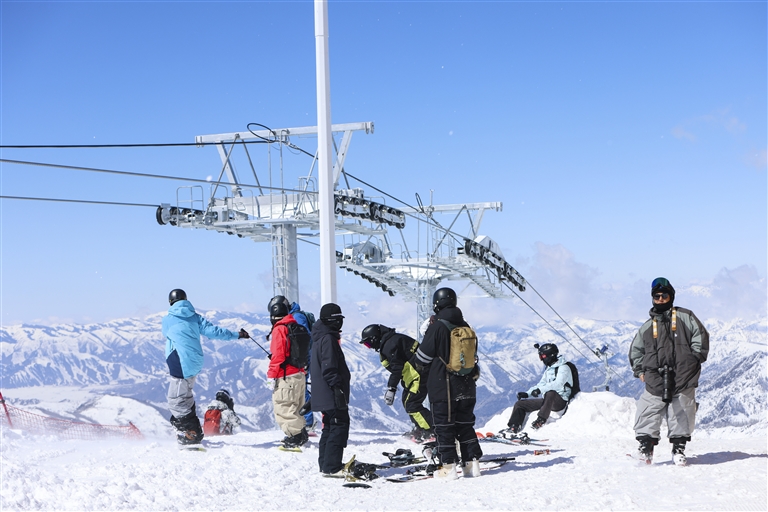 近日,又一场春雪过后,连绵的阿尔泰山脉银装素裹,分外壮美,吸引各地游客前来游玩。据可可托海国际滑雪度假区统计,2023年3月至今,度假区累计接待游客超过12.8万人次。 新华社记者 郝昭 摄