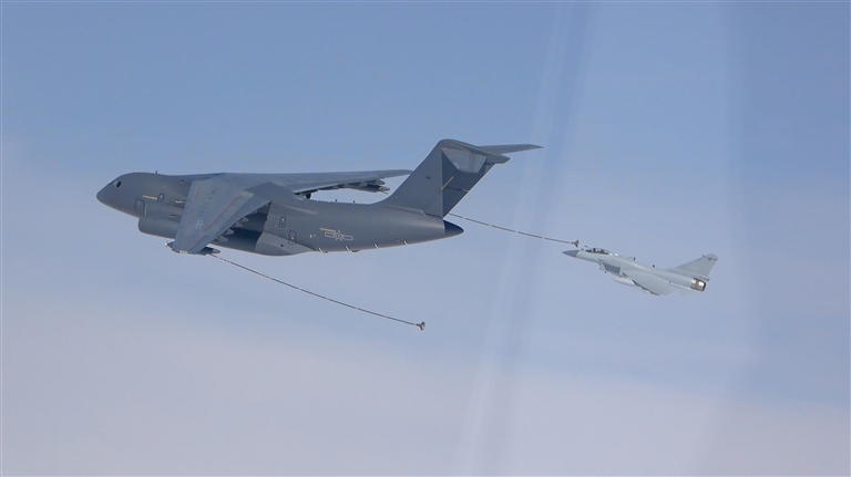 这是战机在进行空中加油(4月9日摄,视频截图) 新华社 发