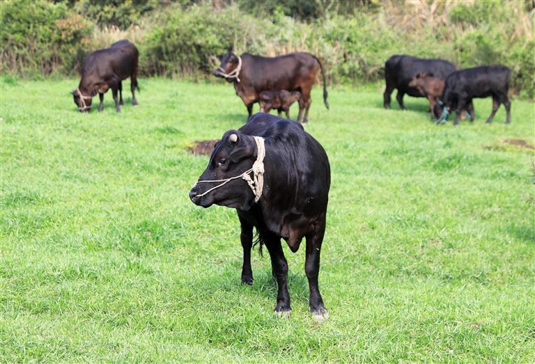 近日,在定海区小沙街道光华村,几头舟山黄牛正在农户看护下食用地头的青草。舟山黄牛属于濒危物种,于2013年被列入《浙江省畜禽遗传资源保护名录》。经相关部门和技术人员多年努力,舟山黄牛的数量已有约150头。摄影 记者 陈永建
