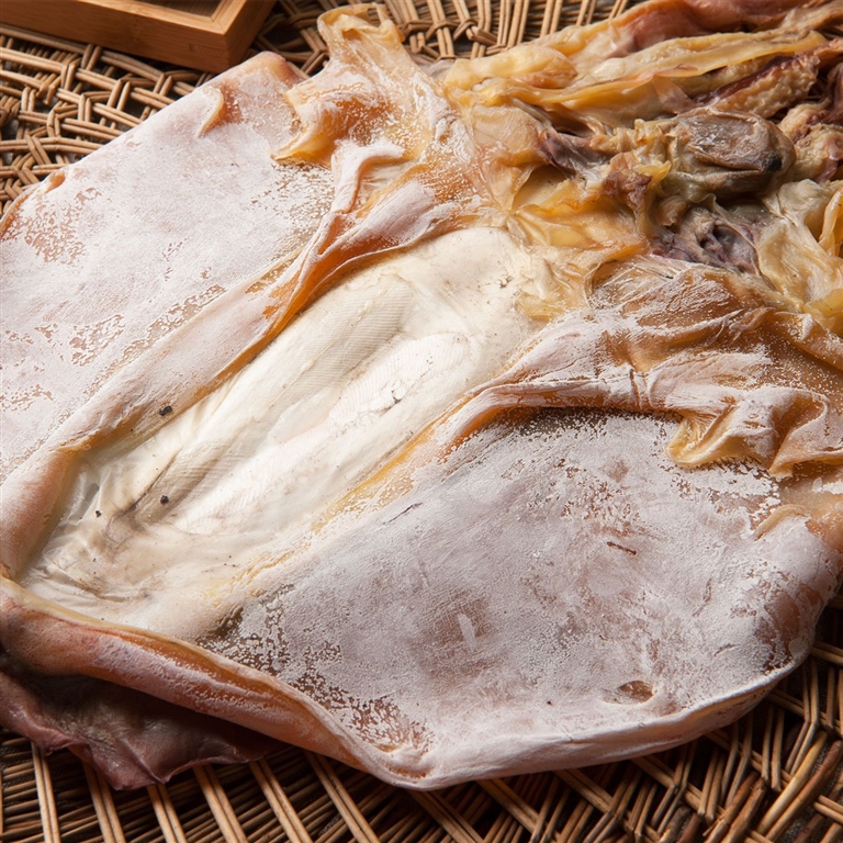 沈家门螟蜅鲞,又称乌贼鲞,平展呈棕红色透明状,外生白霜,干燥洁净有清香,为普陀传统名贵海产品。