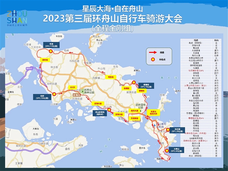 全程起点和终点为舟山体育场,骑行路线囊括了舟山最具代表性的景观——百年渔港沈家门、醉美大青山、最美公路螺塘线、展茅美丽乡村、定海古城要塞等。骑友们可以在享受骑行乐趣的同时,沿着舟山的海岸线,一路饱览蓝天白浪、碧海金沙、海天佛国的美景。