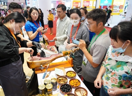 4月12日,参观者在消博会现场品尝产自西班牙的小吃。