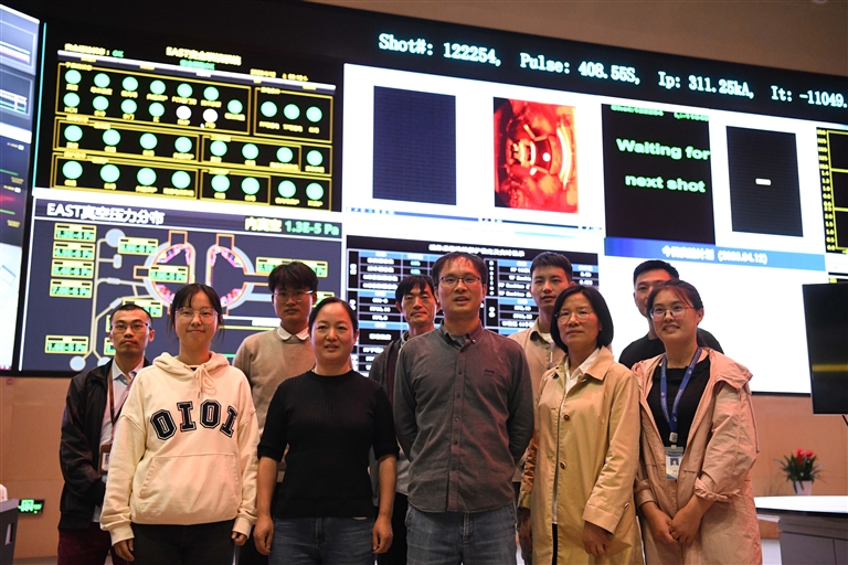 4月12日,部分科研人员在实验成功后的EAST控制大厅留影。