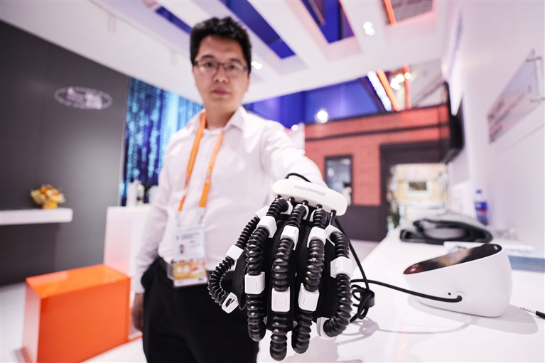 4月11日,参展商在上海展台展示手功能训练机器人。