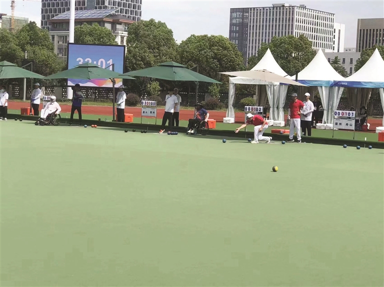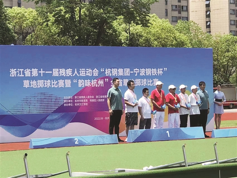 王舟君和林君也是一对搭档,他们在这次省残运会上获得草地掷球男子(B8)双打冠军。王舟君在市残联工作,林君是定海盐仓街道的工作人员,他俩都是轻度肢体残疾。去年6月底参加草地掷球比赛前,他们在工作之余配合练习了一个多月,培养了默契,增进了技能。