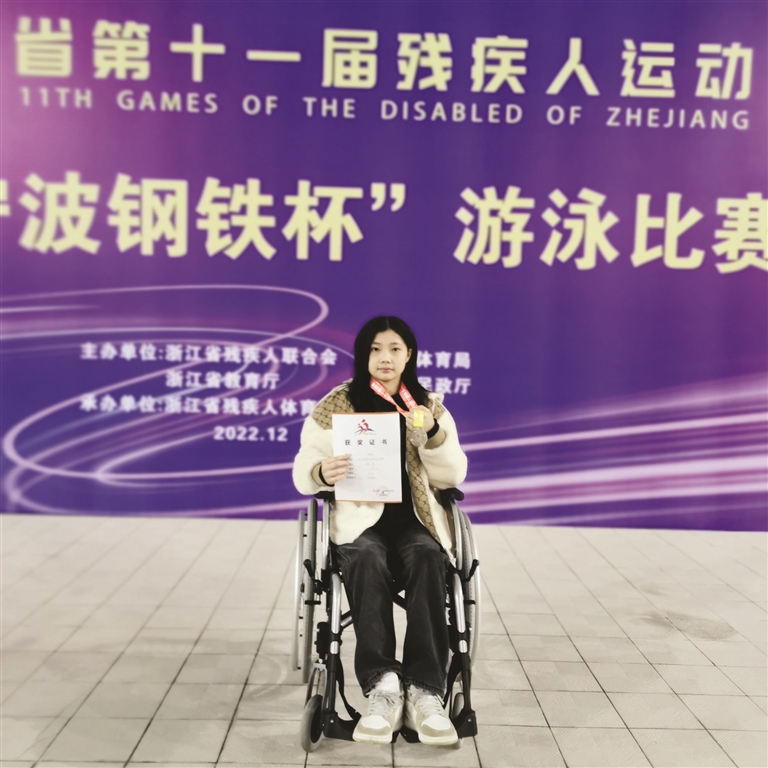 就在此次省第十一届残疾人运动会上,不满16岁的乐雨琳获得游泳女子(S5)100米自由泳亚军及女子(S5)100米蛙泳季军。能取得这样的成绩,她自己非常开心,身边的亲人朋友也给了她满满的祝福。这两块颇有分量的奖牌是对她多年不懈努力的最大认可。