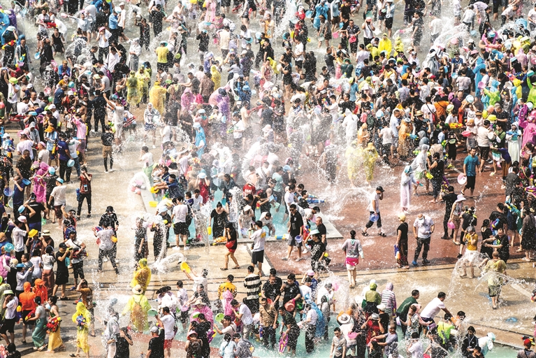 4月15日,人们在云南省西双版纳傣族自治州景洪市泼水广场泼水狂欢。