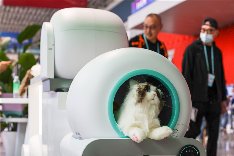 一家中国工业设计企业在第133届广交会上展示的全自动猫砂盆等宠物电器(4月15日摄)。