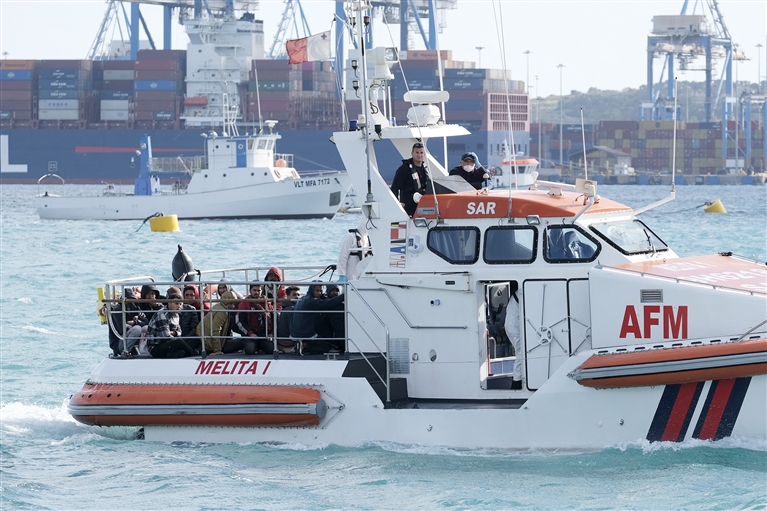 据马耳他媒体报道,约60名非法移民在马耳他海域遇险获救后,于17日晚抵达马耳他南部港口马尔萨什洛克。 新华社 发(乔纳森·博格摄)