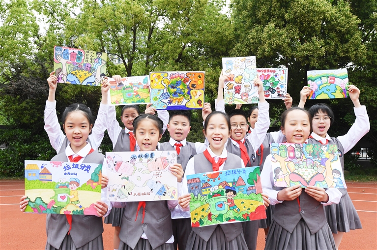 4月20日,湖州新风实验小学下塘校区的学生展示自己创作的环保主题的画作。