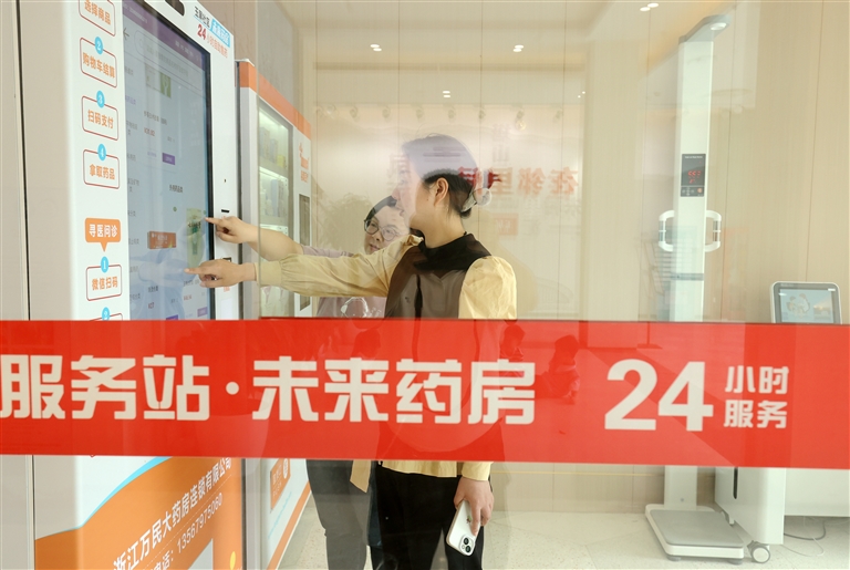 4月20日,居民在湖州市德清县舞阳街道玉屏未来社区24小时自动售药机上购买药品。