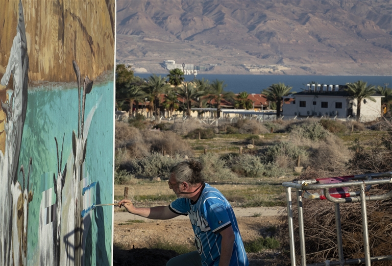 4月20日,艺术家在死海西岸的废弃房屋外墙上创作“关注死海”主题画作。