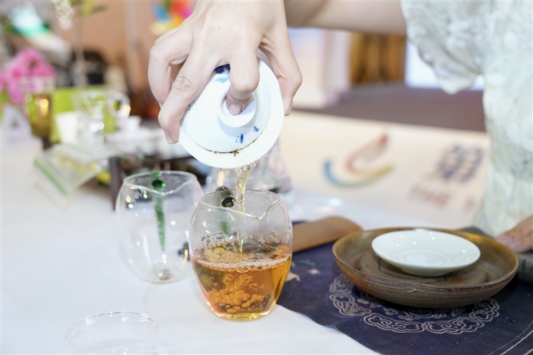 4月21日,在北京茶博会“春茶临京城 共品非遗茶”活动上,茶艺师在倒茶。