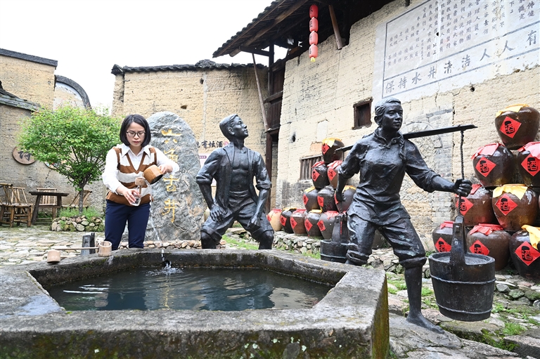 4月20日,游客在屏南县代溪镇北墘村一处可用于酿酒的古井前取水饮用。