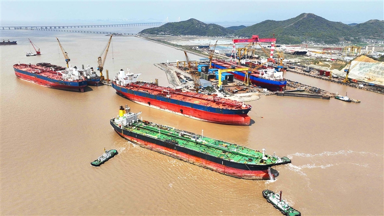 航拍器下,位于定海区长白岛的“太平洋海工”码头泊位和船坞内,多艘船舶陆续停靠并进行修理。连日来,工人们正抓紧工期,争取早日完成修理订单并及时交付。