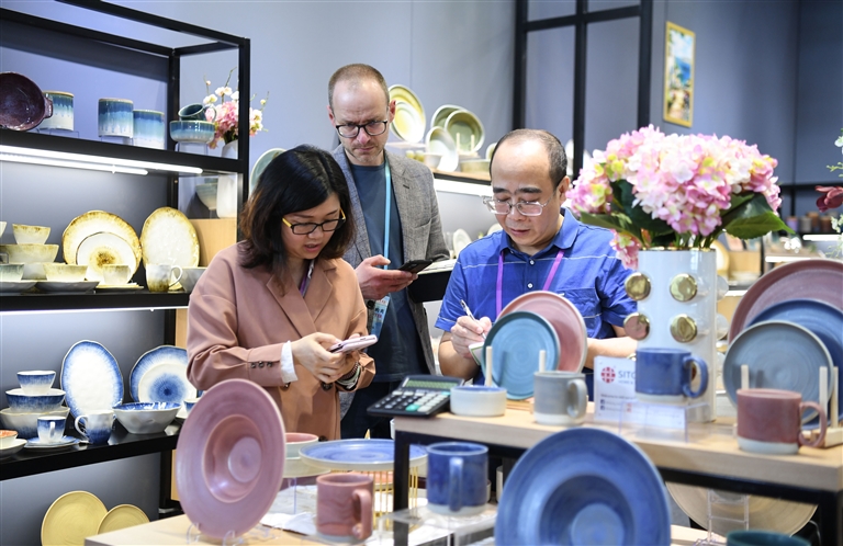 4月23日,采购商和参展商在瓷器展区洽谈。