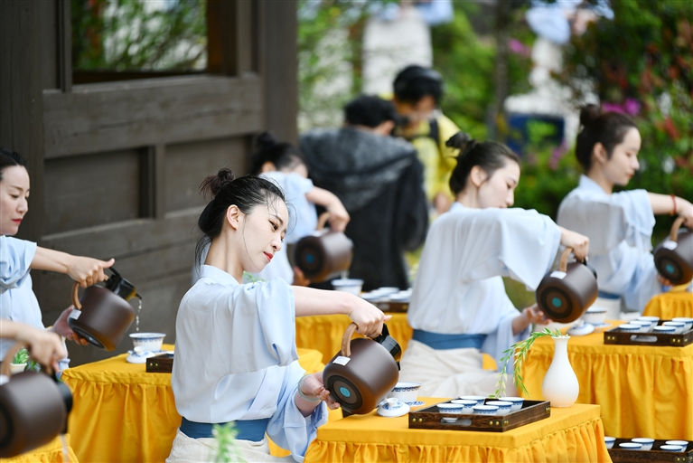 一道茶入定、二道茶入静、三道茶入心……开幕式主舞台上,悠扬的茶曲声中,茶人们冲泡起普陀佛茶,并邀现场宾客共饮。顿时,茶香四溢,浸润人心。现场观众在三道茶中,感受普陀佛茶特有的诗意和普陀茶人“心怀梦想,追逐星辰大海”最风雅的“浪漫”。仪式篇《赴茶会》、茶会篇《寻茶记》、祈福篇《祈茶福》,开幕式活动的三个篇章,将普陀佛茶与茶道礼仪相结合,打造出了一场“返璞归真”、具有仪式感的“佛茶会”。