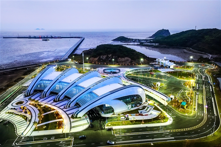 昨天傍晚,随着夜幕降临,新建成的岱山燕窝山客运中心广场灯光陆续亮起,为这座贝壳造型的主体建筑增添了靓丽的色彩。