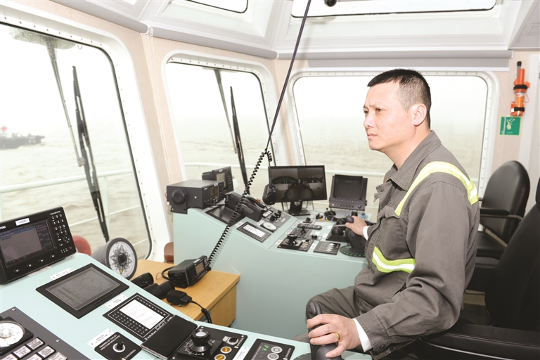 刚刚完成任务,马上又收到了新的船舶进港的信息,朱益明和船员们开始做起了新一轮准备。朱益明说:“最忙的时候,我们一天要拖10多艘船。记得时间最长的一次,从头天下午一直指挥到第二天早上8点多。”