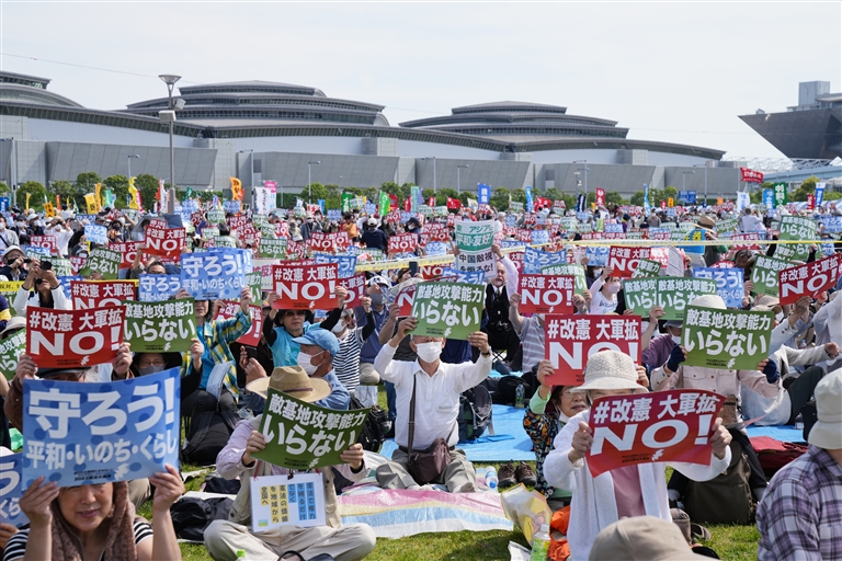 5月3日,民众在日本东京有明防灾公园的广场上举行守护宪法集会。5月3日是日本宪法纪念日。当天,约2.5万名日本民众聚集在东京有明防灾公园的广场上,举行了守护宪法集会,他们打出守护宪法、反对强军扩武、不要反击能力、反对修改宪法等内容的标语和旗帜,呼吁守护宪法、守护和平。 新华社记者 张笑宇 摄
