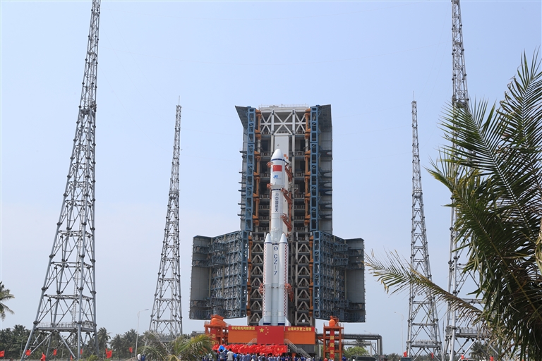5月7日,天舟六号货运飞船与长征七号遥七运载火箭组合体垂直转运至发射塔架。