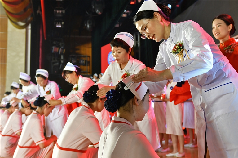 5月10日,山东省烟台护士学校举行护士节授帽仪式。护理前辈为即将踏入实习岗位的学生授帽。 新华社 发(孙文潭 摄)