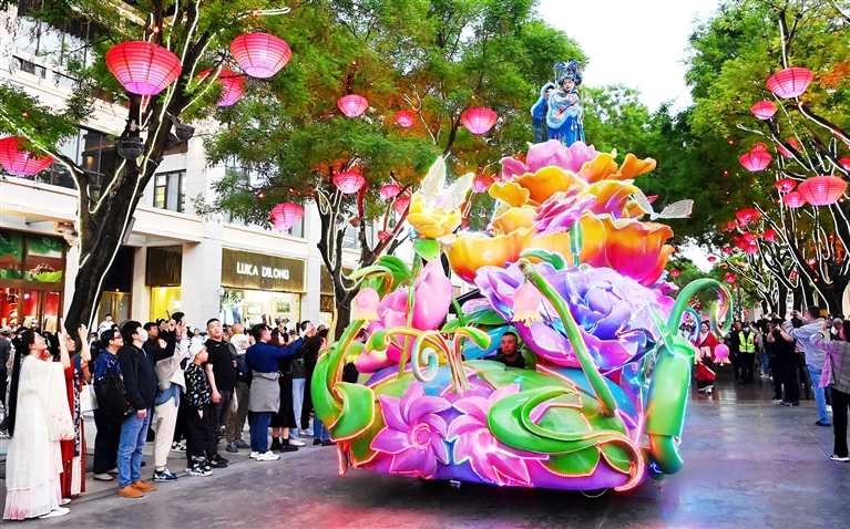 西安大唐不夜城进行的花车巡游(4月25日摄影)。雄踞关中平原中部,北望苍莽黄土高原,南依巍峨秦岭,西安,作为一座拥有3100多年建城史,1100多年建都史的历史文化名城,先后有十三个王朝在此演绎了无数的悲欢离合。一个个文化地标,记录着这座城市在岁月长河中的绝代风华,流淌着生生不息的历史文脉。作为西安文化地标之一的大唐不夜城,位于西安市大雁塔脚下,南北总长2100米,东西宽500米。漫步大唐不夜城步行街区,仿唐建筑飞檐斗拱、层楼叠榭;华灯初上后灯火璀璨、游人如织。白居易笔下的雁塔题名、诗仙李白的醉酒吟诗、古诗古画中的簪花仕女、青史留名的房谋杜断……散落在史书典籍中的故事遗珠,通过现代舞蹈、真人演绎、现场互动等形式,再次呈现在世人面前。千米长街一步一景,传统与时尚精彩碰撞、古老与现代相得益彰。 新华社记者 刘潇 摄
