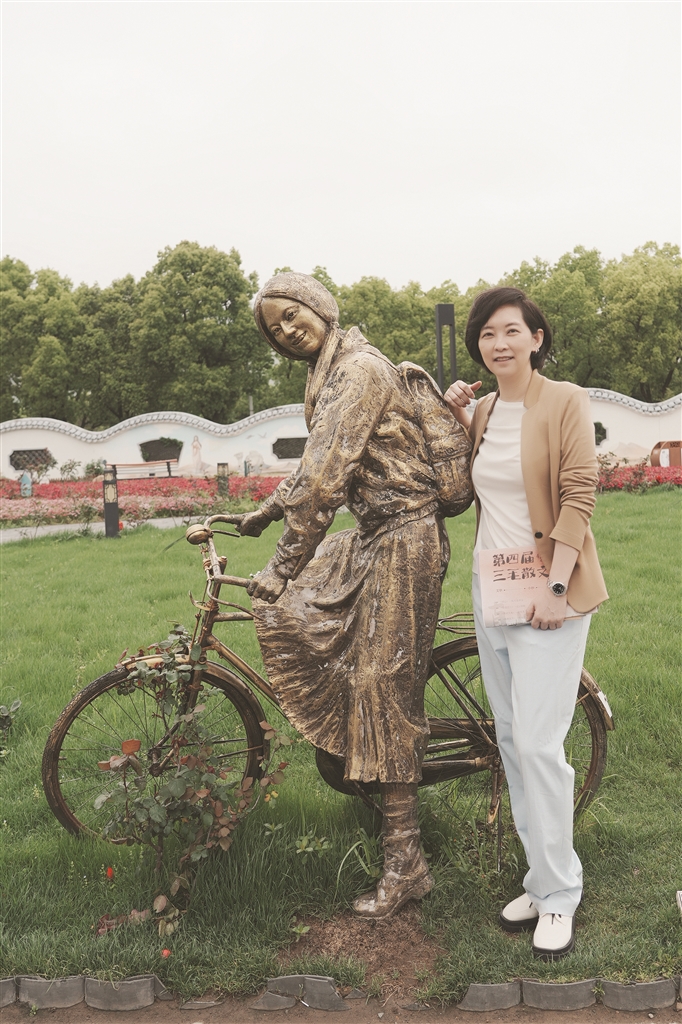 陈天慈:对,这是我第一次回定海。我觉得血缘真的是很奇妙,虽然是第一次回来,但是一回来就有一种天然的亲近感,一点也不陌生,感觉真的回家了。和大家的交流,让我想到小时候家里常常听到的乡音——舟山方言。小时候爷爷奶奶在家里会用舟山方言交流,所以这次回来以后,当我听到舟山方言,就感觉很熟悉,很自然。来到小沙,我特地在祖居前拍了一张照片,还和家乡的亲族长辈们说,陈家的后代回来了。在三毛骑单车的塑像前,我也特地留影。看着这辆单车,我仿佛觉得自己回到小时候,小姑用单车载着我的时光。