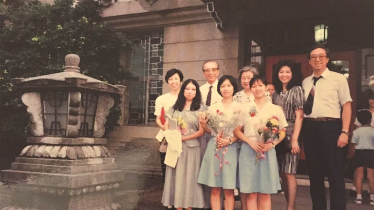 我带来了一张圣心女子中学毕业时和小姑的合影。我就读这所学校,还要从三毛去文化大学教书说起。当时,她结识了很多青年学子,其中一位叫宋平,是戏剧系的。两人很投缘,关系莫逆。宋平是圣心女子中学的校友,于是她邀请三毛去圣心女子中学演讲。演讲结束后她和校长在校园里面逛,在一个影音教室前停下了,有学生正在里面看电影。校长拉开窗帘,想看看学生们在看什么。一般学生看到校长总是有些畏惧,而影音教室里的学生反而催促着校长赶紧把窗帘拉上。校长也挺不好意思,笑着把窗帘拉起来了。三毛在旁边看了就觉得很有意思,这完全和其他学校不一样。她觉得应该把两个侄女天恩、天慈送到这里来读书。后来,我和姐姐在这所学校读书6年,三毛参与了我们的很多学习生活。这张照片就是她来参加我们毕业典礼时拍摄的。