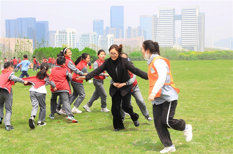 近日,在新城市民广场东侧城市绿地上,来自沈家门小学参加研学的师生正利用中午休息时间或游戏、或观光,畅享快乐美好时光。据了解,该地块为“打开围墙”环境整治地块,总面积为3万平方米,经过平整、微地形改造、绿植种植等,环境面貌得到显著改善。摄影 记者 陈永建