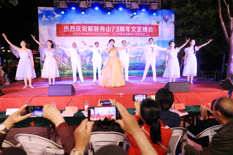 由市青年越剧团文艺党支部和定海区戏剧演唱协会文艺党支部共同主办的热烈庆祝解放舟山73周年文艺晚会,昨晚在定海双拥广场举行。