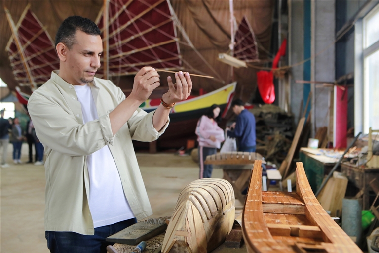 在岑氏仿古木船作坊,中国网外籍专家候萨穆对仿古木船制作工艺表现出浓厚的兴趣 中国日报网供图