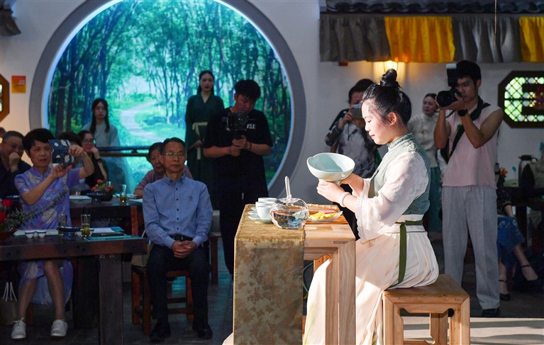 第七届洛迦茶会昨天下午在新城举行,蓬莱仙芝、普陀佛茶、定海红茶和莲花茶四道茶飘香礼客。我市现有茶园总面积9405亩,年总产量持续稳定在40吨左右,其中普陀佛茶农产品地理标志入选了中欧地理标志协定保护名录。 摄影 记者 沈磊