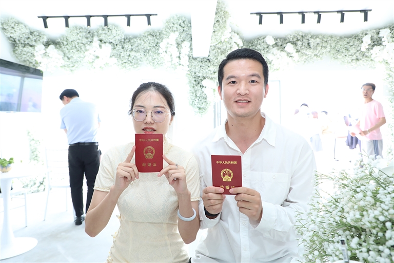 “从今以后,花鸟岛对我们而言有了更深刻的意义。”在飞鸟贺喜、鲜花簇拥的“花栖鸟”颁证基地,娄宇升和张姣夫妇拿着新鲜“出炉”的“红本本”,脸上洋溢着幸福的笑容。他们也是基地迎来的第一对新人。