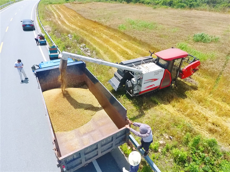 5月23日,在普陀区六横镇滚龙岙村,2台中型联合机在麦田来回穿梭,趁天晴抢收成熟的小麦。据六横镇渔农科相关负责人介绍,今年六横种植的约4500亩小麦有望迎来丰收,预计平均亩产在300公斤左右。
