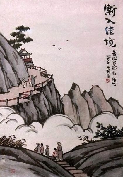 《渐入佳境》还有一个1962年的版本,绘有高山亭台,树木茂密,松树下有一凉亭,亭中有两人,围栏内两位老者持杖慢行,山脚下有一对男女,一位儿童,一位长者共四位朝山者拾级而上。右上角题“渐入佳境”四字,落款“一九六二年国庆节,子恺画”。