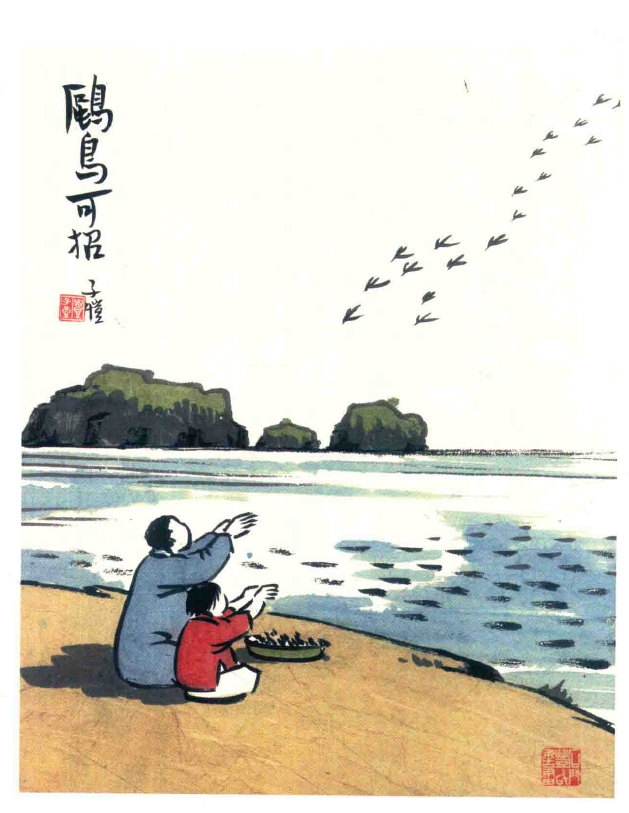 《鸥鸟可招》所绘的也是南天门的场景。画作绘沙滩、碧水和远山,沙滩上一孩童和一男子伸出双手,应是以食物来吸引远方的海鸥。画中的沙滩以及远山,正与《海不扬波》中的沙滩和远山相对应,据此,可以推测其处于普陀山的南天门。