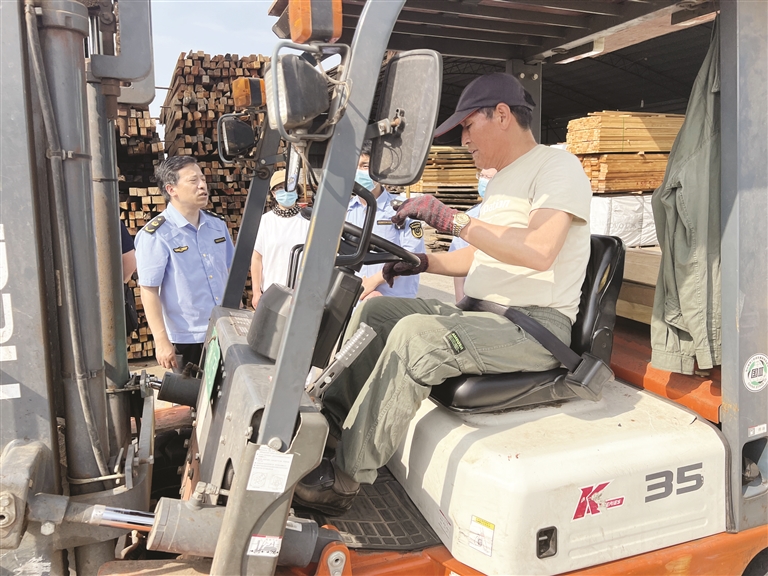 随后,执法人员又来到美屋木业。厂区的两辆叉车属于特种设备。在执法人员的示意下,叉车司机进行了制动、转弯、液压提升、转向灯交换等操作(图二)。执法人员还重点检查了叉车的使用登记证和法定检验合格报告、作业人员特种设备证件、叉车专用行驶路线和安全警示标志设置情况等,并要求企业完善监管台账,切实做好叉车安全管理,严格按照规定履行主体责任。