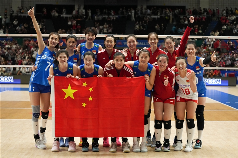 6月4日,中国队球员在赛后合影。当日,在日本名古屋举行的2023世界女排联赛分站赛中,中国队以3比0战胜日本队,从而以四战四胜的战绩结束了本站比赛。