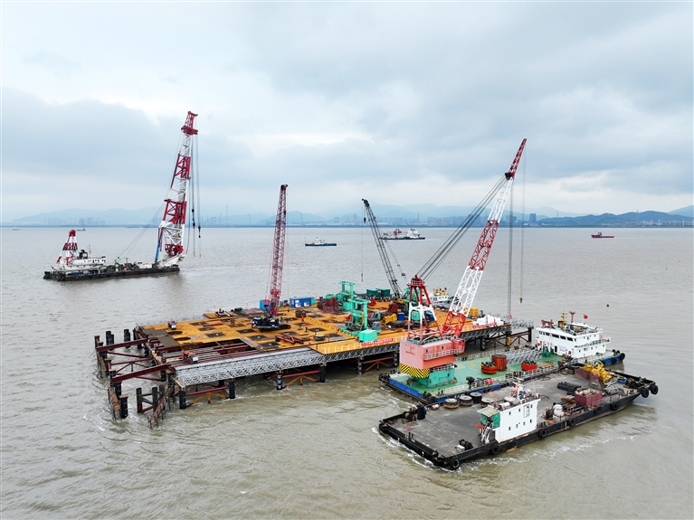 昨天,宁波舟山港六横公路大桥二期工程青龙门特大桥Q5墩(梅山岛侧)建设工地,一个面积5544平方米的水上作业平台已基本建成,三台钻机也已经搭设完成。另一侧(佛渡岛侧)的Q3主墩钢护筒施打也接近尾声。