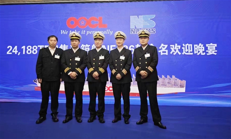 船长林益军(中)、轮机长陈登飞(右二)、大管轮陶兆波(右一)在“东方土耳其(OOCL Turkiye)”命名仪式上合影