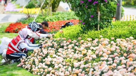 近日,在普陀山机场出入口,园林工人正在打理盛开的月季花。普陀山-朱家尖管委会大力打造“花海彩林”,以良好的门户形象和城市品质迎接杭州亚运会。