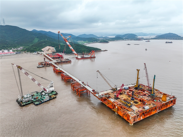 昨天傍晚,位于定海区册子岛海边的甬舟铁路西堠门公铁两用大桥工地,全长650米的一侧海上施工栈桥建成,将为后续主墩桩基施工提供有力保障。