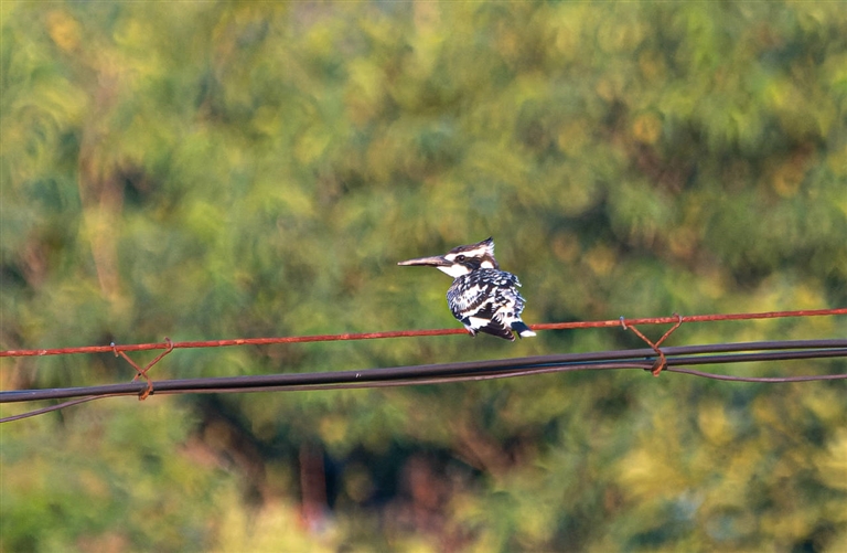 据了解,6月上旬,该调查团队发现了这只斑鱼狗,遂展开了连续多天观察。其间这只斑鱼狗总在该处海岸附近徘徊,常停在电线上休憩(见图)。