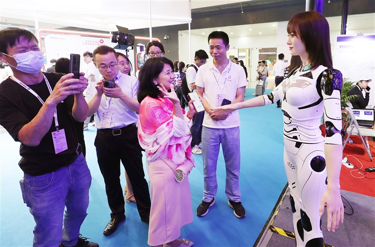6月15日,参观者在一款人形机器人前驻足观看。当日,第九届中国(上海)国际技术进出口交易会在上海世博展览馆开幕,近千家参展企业齐聚上海,搭建展示全球创新成果和解决能力的平台。本届上交会秉承“创新驱动发展、保护知识产权、促进技术贸易”理念,设置主题馆、能源低碳技术、数字技术、生物医药、创新生态及服务五大展区。 新华社记者 方喆 摄